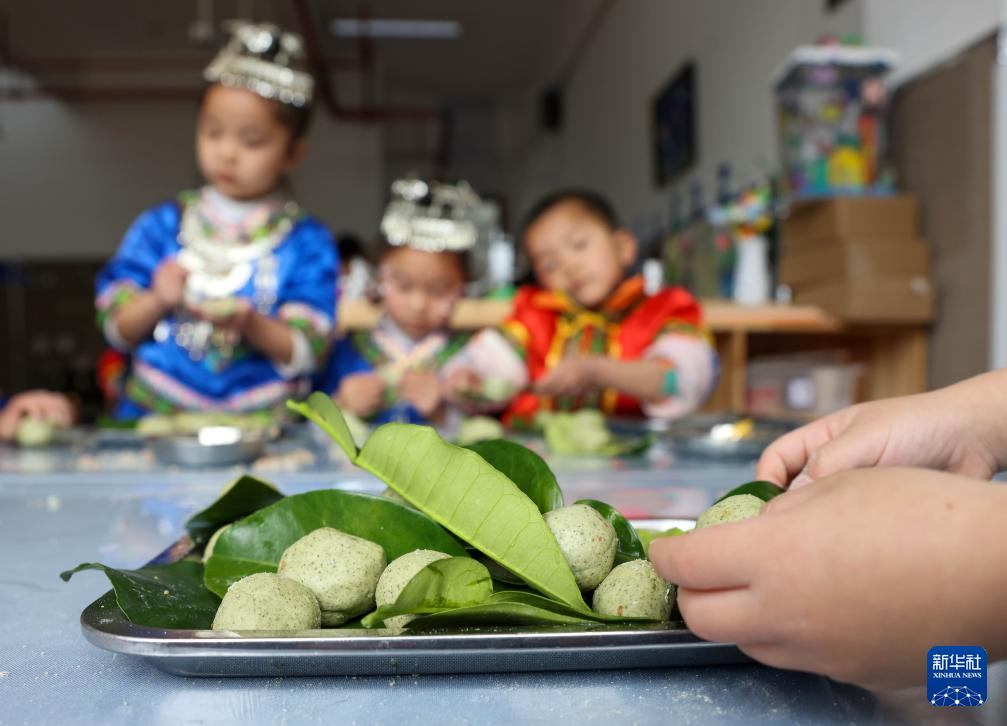 3月31日,农历三月初三,贵州省铜仁市玉屏侗族自治县的幼儿园小朋友制作“三月粑”。