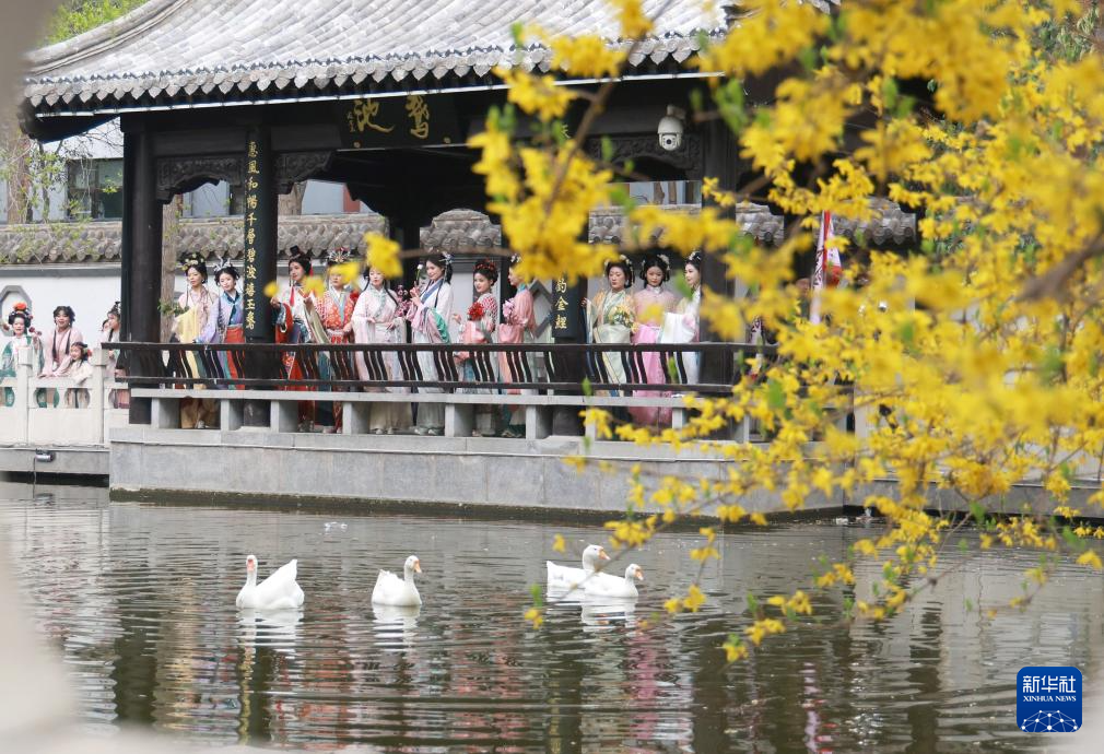 3月29日,在山东省临沂市王羲之故居,身着传统服装的女子参加迎接“三月三”的活动。