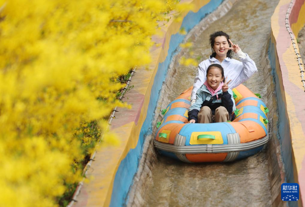 4月4日,游客在山东省临沂市沂南县铜井镇竹泉村体验漂流。
