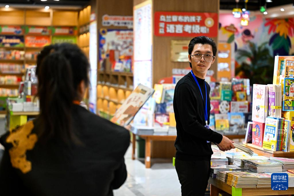 4月21日,在乌兰察布市集宁区言知书店,巩懋林(右)与妻子蒲欣交流图书情况。