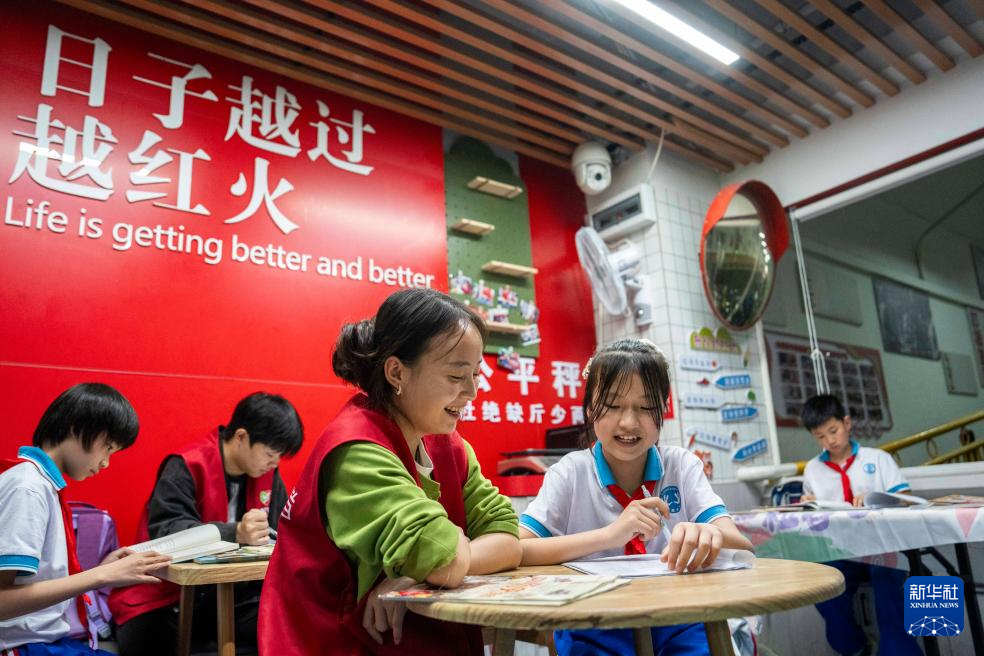 4月23日,志愿者在长沙华夏农贸市场“四点半角”辅导学生功课。