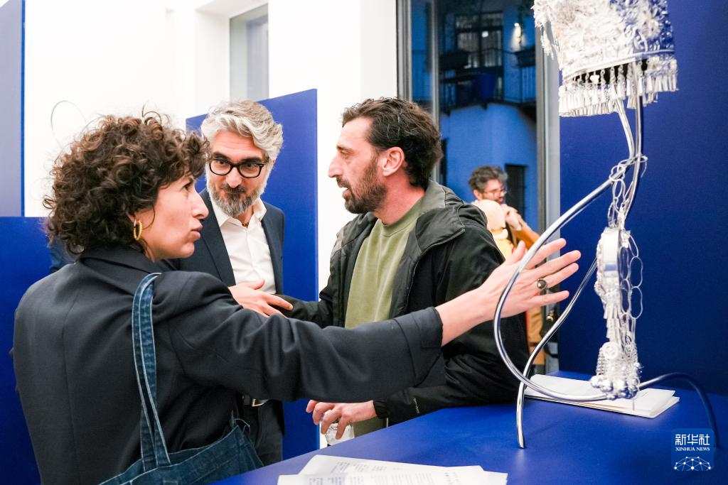 4月13日,在意大利米兰,意大利设计师与参展嘉宾观看米兰设计周贵州工业设计城展区陈列的银饰展品。