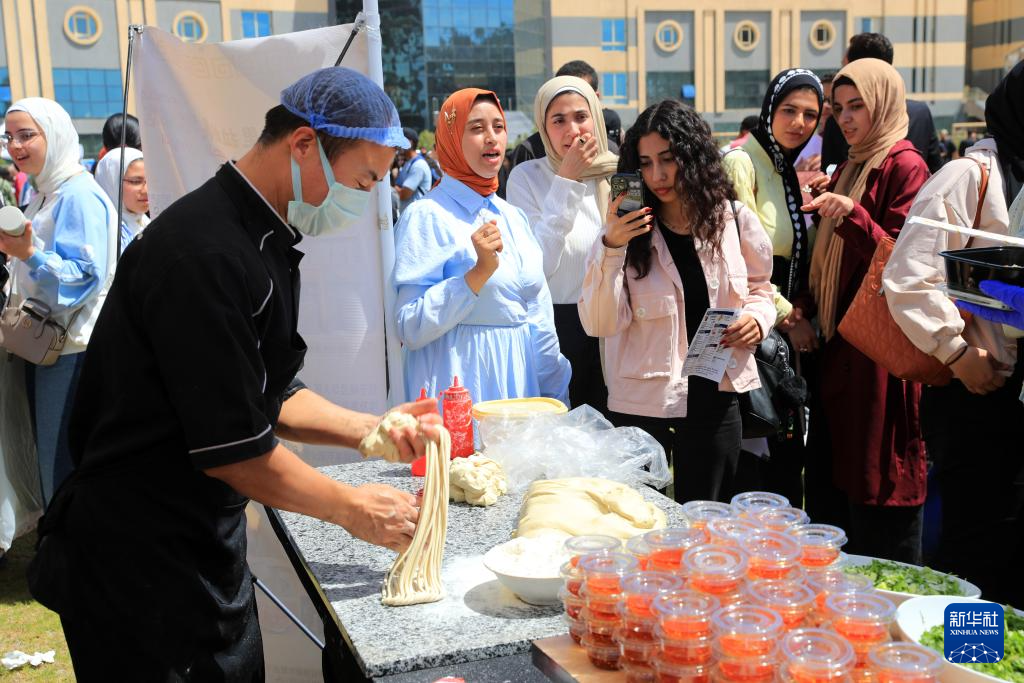 4月27日,学生在埃及开罗举行的“国际中文日”活动上观看拉面制作。