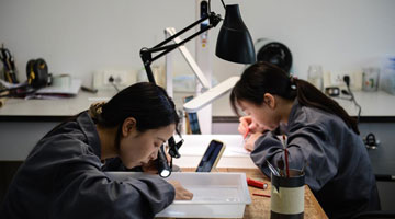 4月28日,在宁乡市炭河古城景区,学生(左二)在工作前化妆。