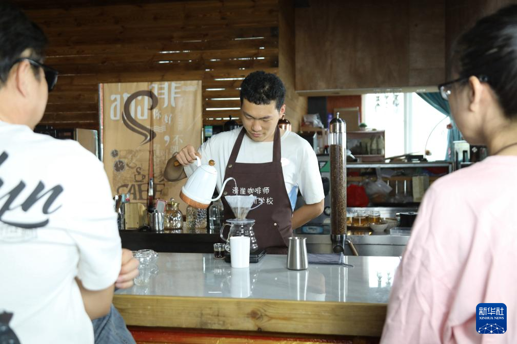 咖啡师在云南省普洱市宁洱哈尼族彝族自治县一家咖啡庄园冲泡咖啡(2025年5月15日摄)。