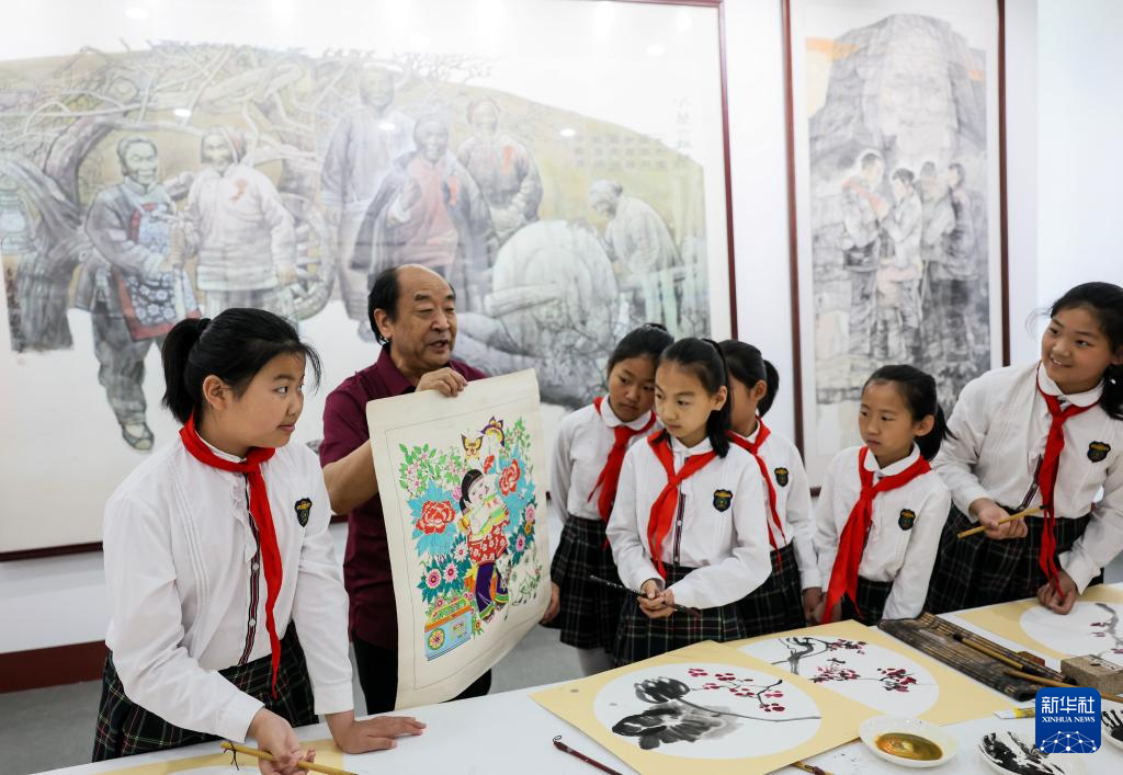 5月24日,在莒县沂蒙画派研究院,小学生们学习沂蒙画派绘画技巧。