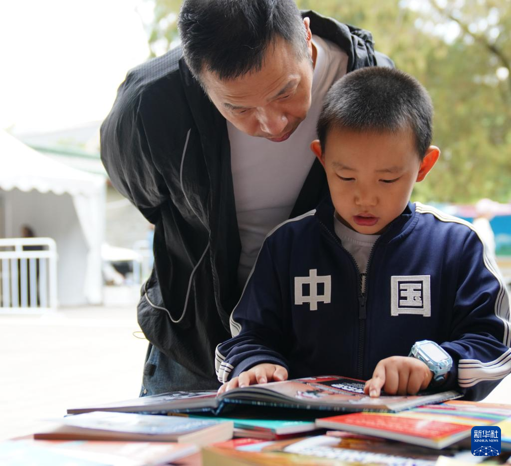 9月22日,小朋友在家长陪同下在地坛书市上挑选书籍。