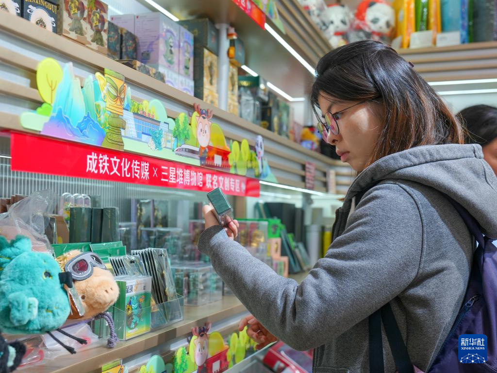 游客在四川省广汉市三星堆博物馆内的文创商店选购文创产品(10月30日摄)。