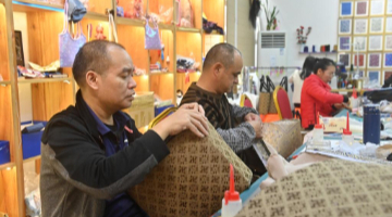 12月17日,在广西宾阳壮锦文创馆,工人制作壮锦文创产品。