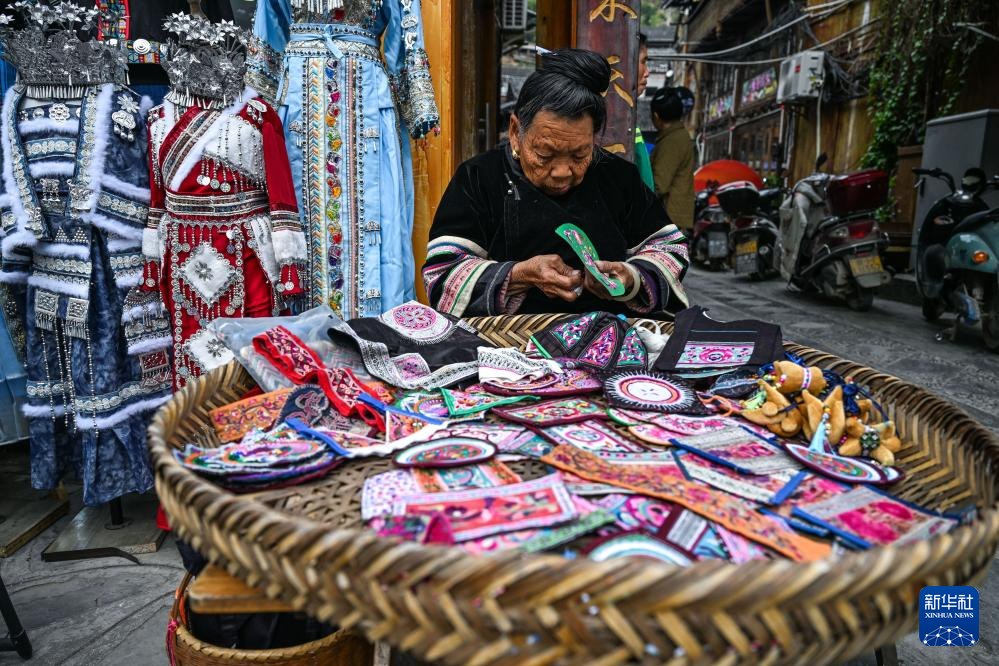 贵州省黎平县肇兴侗寨的村民在刺绣(12月19日摄)。