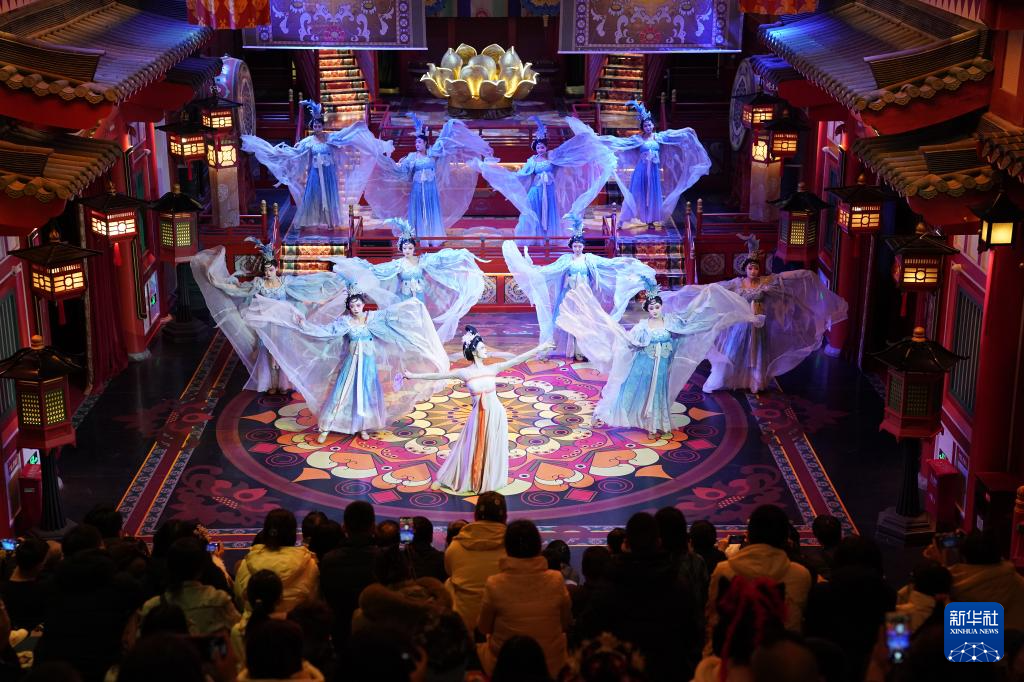 12月23日,演员在街区内表演大唐乐舞《霓裳羽衣舞》。