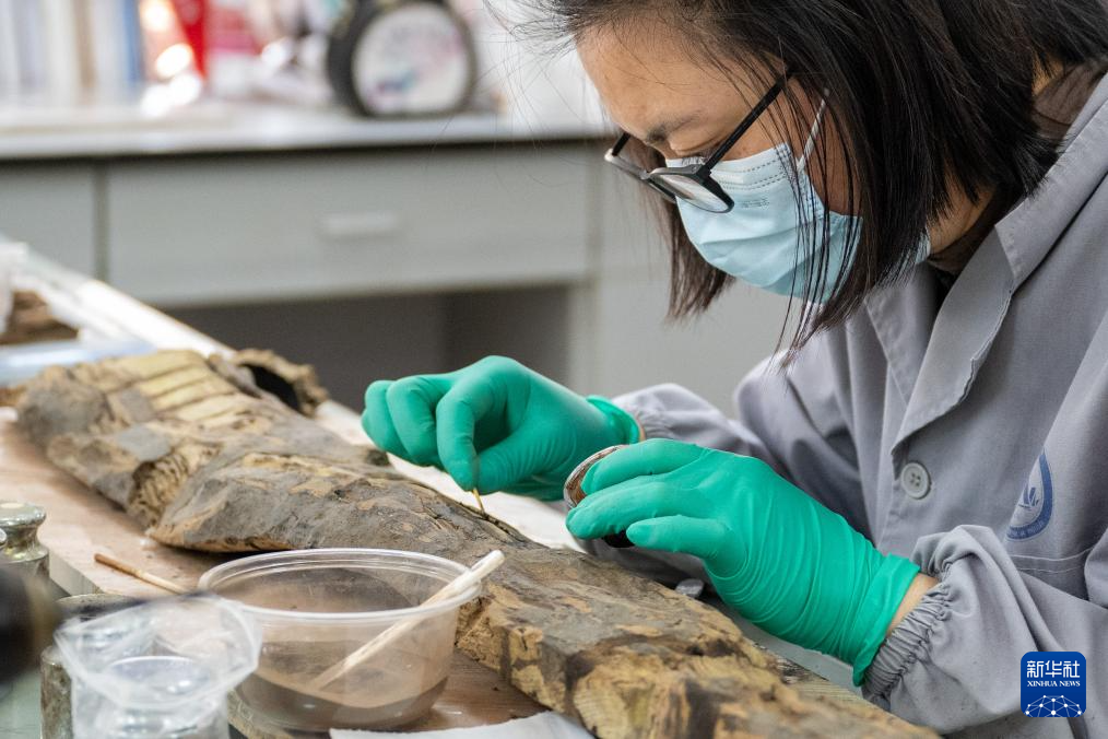 1月9日,在湖北荆州文物保护中心,工作人员对文物进行胎体修复。