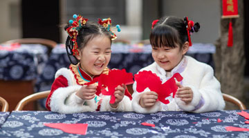 2月4日,在天津杨柳青画社,画师为年画调色。