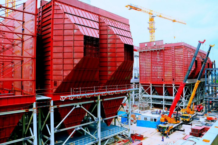 你看,那个内径7米、高度120米的钢烟囱,是国内最高的单筒自立式钢烟囱,在行业内中尚属首次应用,和常规混凝土浇筑烟囱相比,既大幅压降了工期,又节约了施工场地。