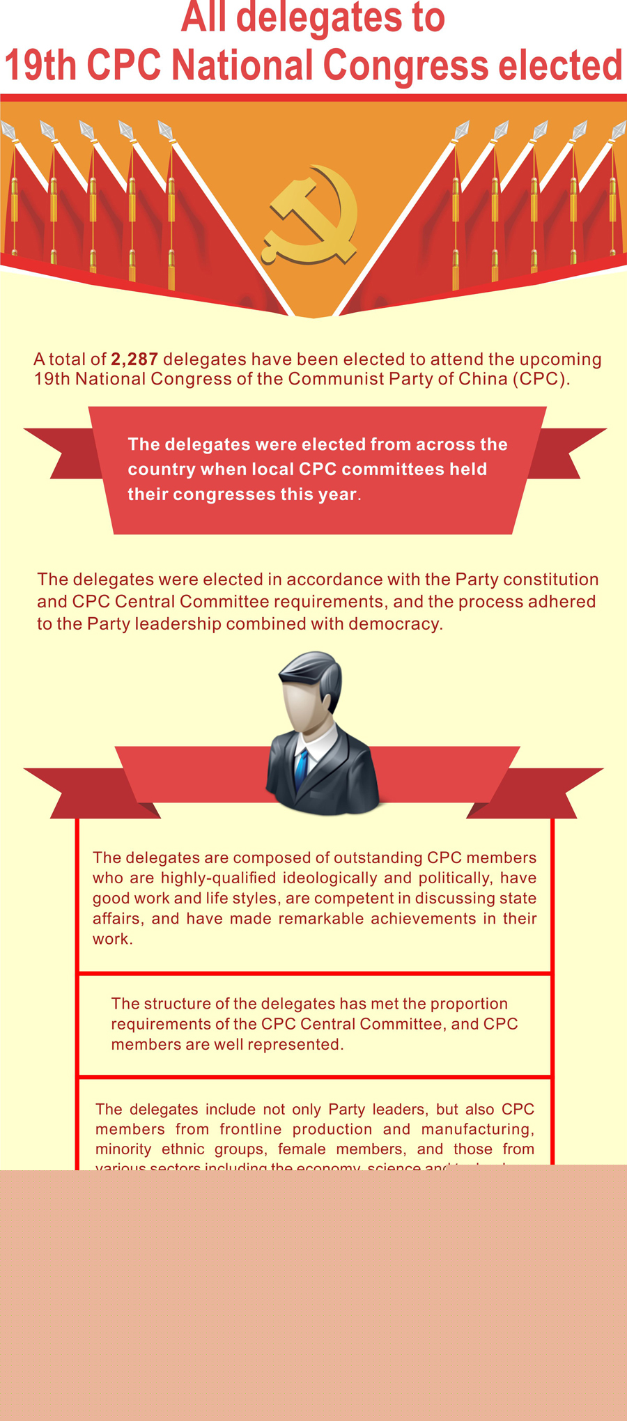 According to a circular issued by the CPC Central Committee in November 2016, frontline workers should account for no less than one-third of the delegates.