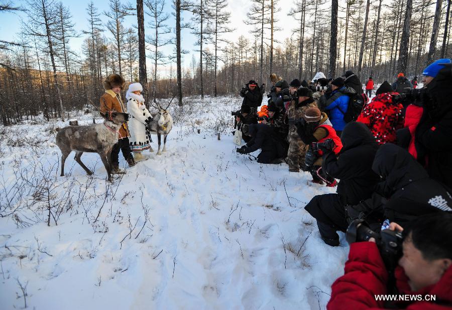 Tourists take pictures of local people at Mangui Township in in Hulunbuir, north China's Inner Mongolia Autonomous Region, Dec. 20, 2017. The 2017 Greater Khingan Ice and Snow Festival closed here on Friday. (Xinhua/LiRenzi)