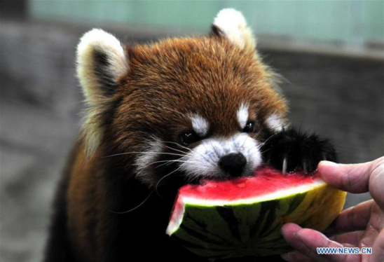 A lesser panda eats watermelon at Shanghai Zoo in east China's Shanghai, July 21, 2017. (Xinhua/Zhang Jiansong)