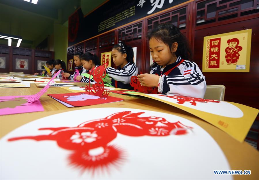 Students practice paper cutting at Puyu School in north China's Tianjin Municipality, Jan. 3, 2018. Intangible cultural heritage lessons, such as Yangliuqing new year painting, paper cutting and traditional drum performance, were introduced into the school. (Xinhua/Liu Dongyue)