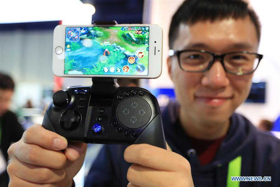 A staff member shows a Chinese Gamesir G5 gamepad at Consumer Electronics Show (CES) in Las Vegas, the United States, Jan. 10, 2018. (Xinhua/Li Ying)