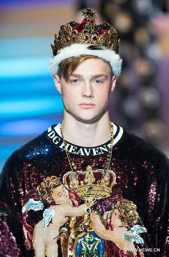 A model presents creations for fashion house Dolce&Gabbana during Milan Men's Fashion Week Fall/Winter 2018/19 in Milan, Italy, Jan. 13, 2018.(Xinhua/Jin Yu)