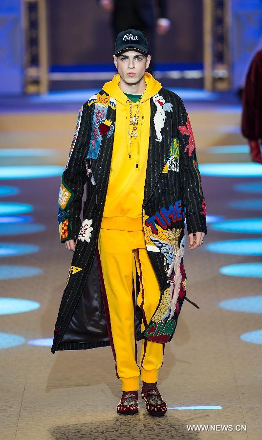 A model presents creations for fashion house Dolce&Gabbana during Milan Men's Fashion Week Fall/Winter 2018/19 in Milan, Italy, Jan. 13, 2018.(Xinhua/Jin Yu)