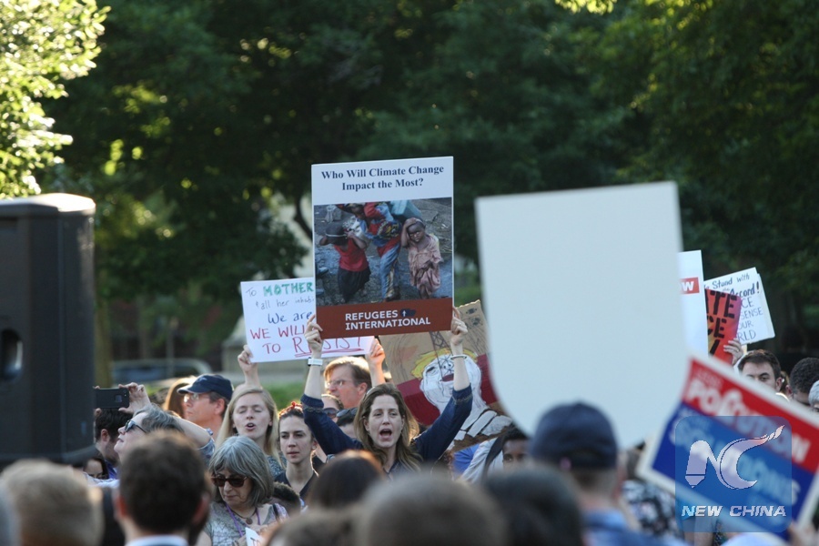 A demonstration is held to protest against U.S. President Donald Trump's decision to withdraw from the Paris Agreement, outside the White House in Washington D.C. June 1, 2017. (Xinhua/Yan Liang)