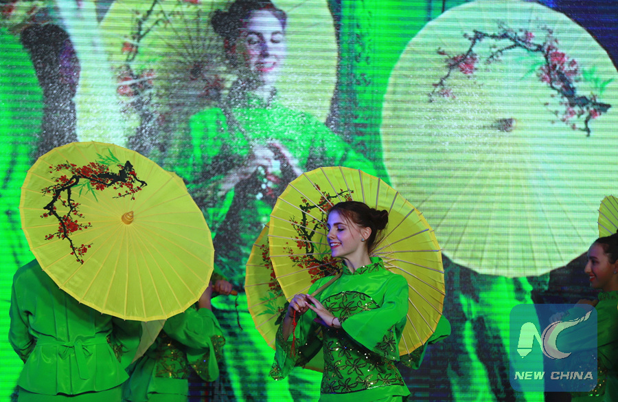 A Ukrainian woman performs Chinese traditional dance at a ceremonial reception in Kiev, Jan. 23, 2018. (Xinhua/Chen Junfeng)