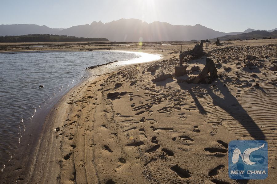 Fiel photo taken on May 28, 2017 shows minimal water left in Theewaterskloof dam located on the Sonderend River near Villiersdorp, Western Cape, South Africa. Cape Town, South Africa's Mother City is facing a water crisis that hasn't been seen in a century. (Xinhua/Andre Louw)