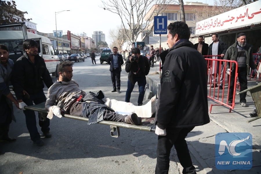 People carry an injured man from the blast site near Sidarat Square in Kabul, Afghanistan, Jan. 27, 2018. (Xinhua/Rahmat Alizadah)