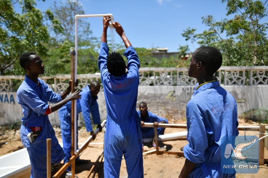 Trainees test the shower head they installed during a class at the training centre ELMAN, a non-government organization (NGO) which cooperates with the United Nations Children's Fund (UNICEF), in Mogadishu, Somalia, March 22, 2017. By the year of 2017, more than 1630 children and teenagers have taken vocational training courses such as automobile maintenance, basic electricity knowledge and circuit maintenance skills, mobile phone repairing and computer using. A vast majority of the students here were former child soldiers or affected by armed groups. The knowledge and skills they learned here will help them to start a new life once they are reintegrated into their communities. (Xinhua/Sun Ruibo)