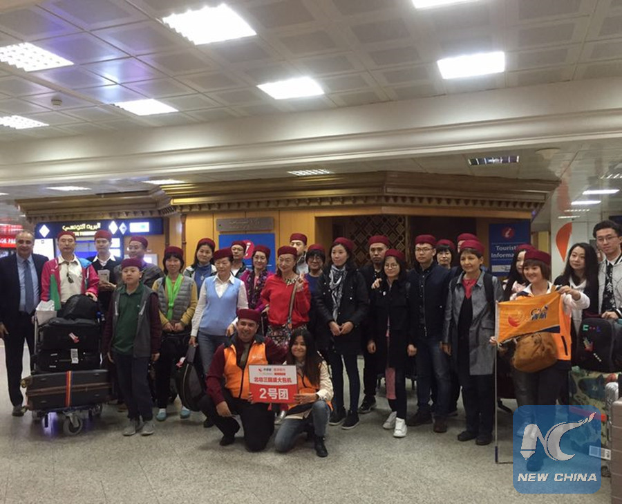 The first Chinese chartered-flight tourist group arrived in Tunisia on February 20, 2018. (Xinhua photo provided by Chinese tourist)