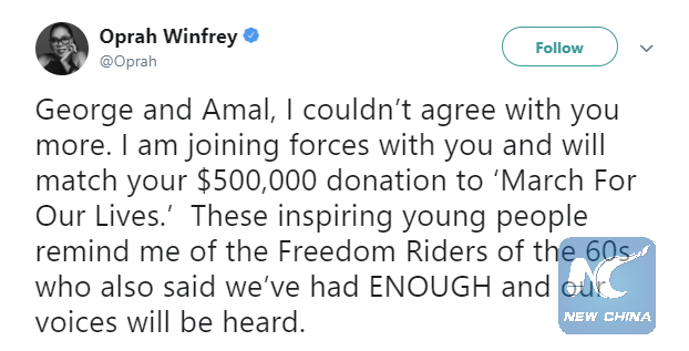 "George and Amal, I couldn't agree with you more. I am joining forces with you and will match your $500,000 donation to 'March For Our Lives'. These inspiring young people remind me of the Freedom Riders of the 60s who also said we've had ENOUGH and our voices will be heard," tweeted Winfey.
