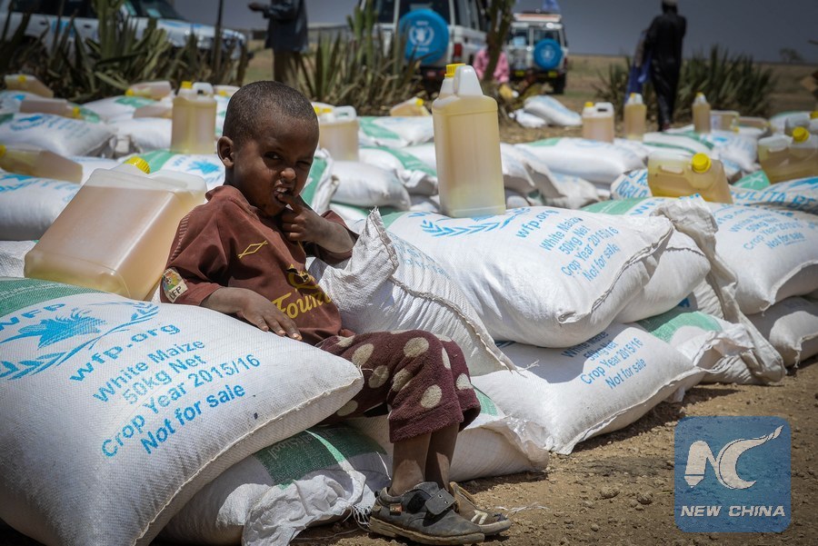 File photo shows a boy waiting for the relief food to be distributed in Harores Wereda, Southeastern Ethiopia, April 12, 2017. (Xinhua/Michael Tewelde)