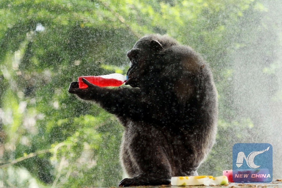A chimpanzee enjoys cold beverage offered by staff members at the Dusit Zoo in Bangkok, Thailand, March 30, 2017. (Xinhua/Rachen Sageamsak)