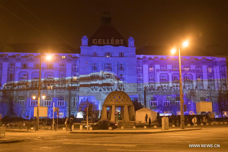BUDAPEST, March 3 (Xinhua) -- The Gellert Hotel, one of Hungary's most famous hotels, got painted by lights in the colors of China and the European Union here on Saturday evening to celebrate the EU-China 2018 Tourism Year.