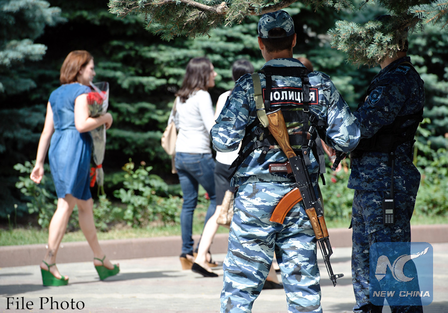 Policemen patrol on a square in Makhachkala, capital city of the Dagestan Republic, Russia, June 24, 2013. (Xinhua/Jiang Kehong)