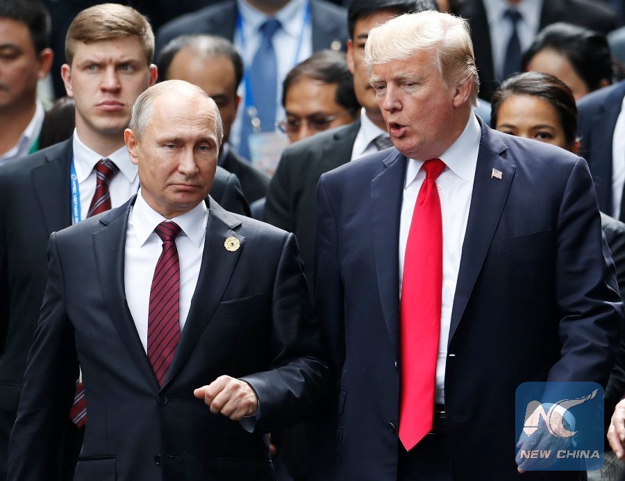 In this file photo taken on Nov. 11, 2017, U.S. President Donald Trump (R) and Russia's President Vladimir Putin talk as they make their way to take the "family photo" during the Asia-Pacific Economic Cooperation (APEC) leaders' summit in the central Vietnamese city of Danang. (Xinhua/AFP)