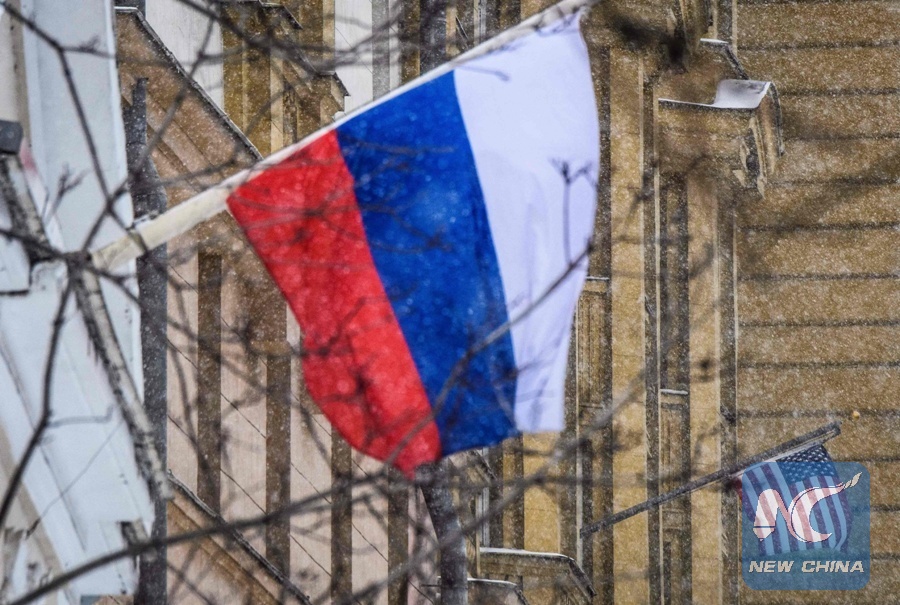 A Russian flag flies next to the U.S. embassy building in Moscow on March 27, 2018. (Xinhua/AFP)