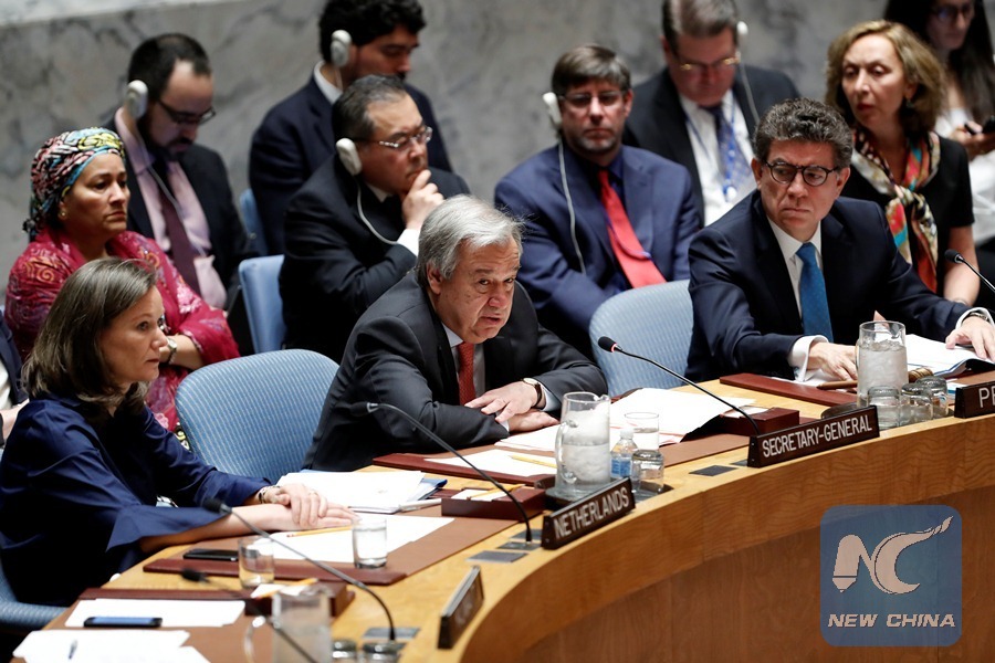 United Nations Secretary-General Antonio Guterres (C, front) addresses a Security Council emergency meeting on Syria at the UN headquarters in New York, April 14, 2018. Russia has requested an emergency meeting of the Security Council for Saturday to discuss the situation after airstrikes in Syria by the United States, France and Britain. (Xinhua/Li Muzi)