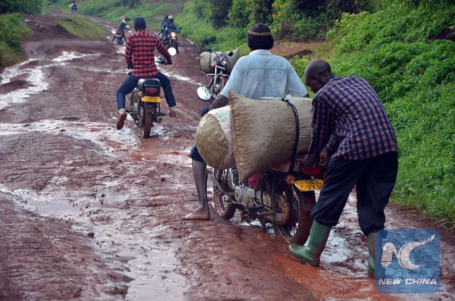 A motorcycle rider ferries arabica coffee cherries in Kamu town council, Bulambuli district, eastern Uganda, April 28, 2018. The Ugandan government has warned resident around Mt. Elgon and Rwenzori to vacate the steep slopes following the ongoing torrential rains. (Xinhua/Daniel Edyegu)