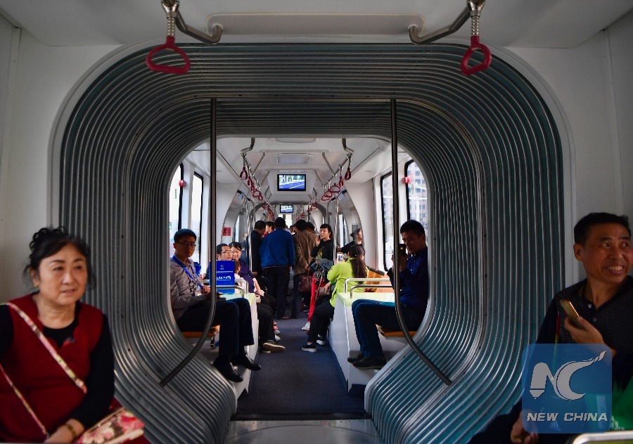 Citizens take a smart bus during the test run in Zhuzhou, central China's Hunan Province, Oct. 23, 2017. The test run of the ART, Autonomous Rail Rapid Transit, started in Zhuzhou on Monday. The ART is developed by the research arm of CRRC Zhuzhou Locomotive Co., Ltd., which produces key parts for China's high-speed railway. The bus is about 30 meters long and equipped with sensors that can read the dimensions of roads and plan its own route. (Xinhua/Xue Yuge)