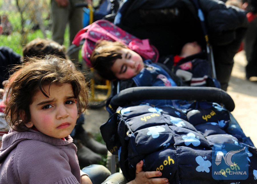 Children wait to be transferred to a safe shelter from the Hamouriyeh area in Eastern Ghouta of Damascus, Syria, on March 17, 2018. (Xinhua/Ammar Safarjalani)