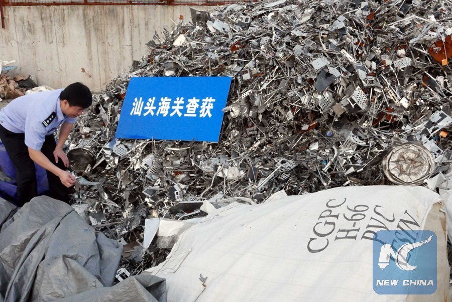 A customs officer checks solid waste in Shantou, south China's Guangdong Province, May 22, 2018. China has banned 24 categories of solid waste imports since the end of 2017. (Xinhua/Yuan Guohong)