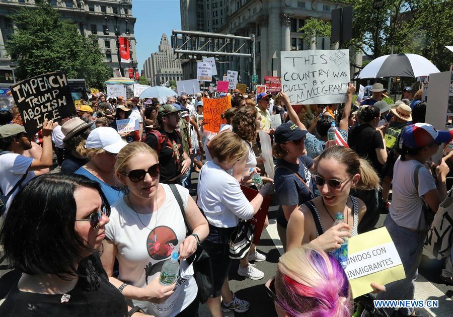 People participate in the "End Family Separation NYC" rally at downtown Manhattan in New York, the United States, on June 30, 2018. Tens of thousands of Americans marched and rallied across the United States to protest the Trump administration's "zero tolerance" immigration policy resulting in over 2,000 children separated from their families who crossed the border illegally. (Xinhua/Zhou Sa'ang)