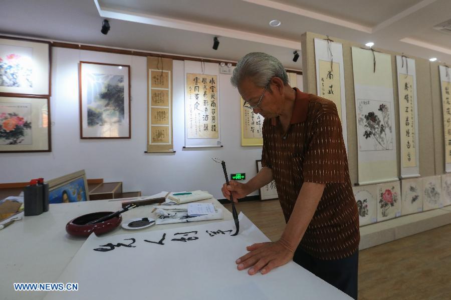 Song Rendou writes Chinese calligraphy in the Muyun'an community of Rongcheng City,east China's Shandong Province, July 5, 2018. The Muyun'an community is famous for painting and is dedicated to boosting tourism based on cultural heritages. (Xinhua/Wang Nan)