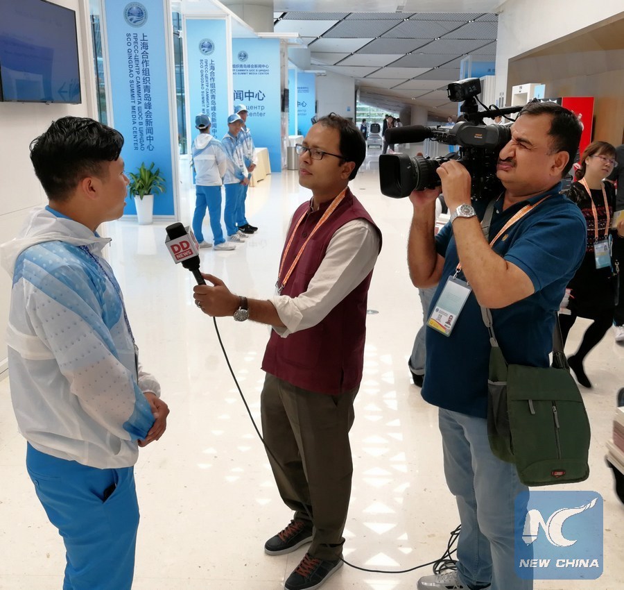 File photo taken on June 7, 2018 shows a journalist from India interviews a volunteer at the media center of the 18th Shanghai Cooperation Organization (SCO) summit in Qingdao, east China's Shandong Province. (Xinhua/Li Ziheng)