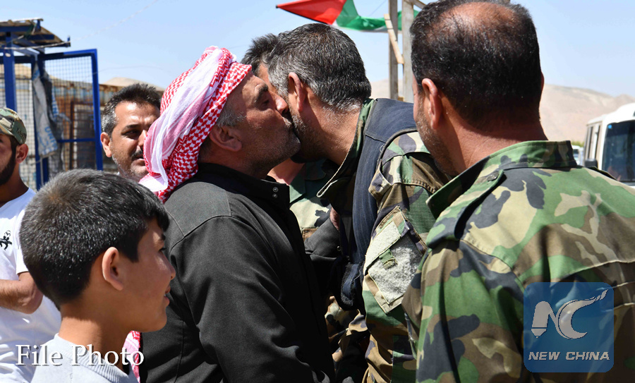 A Syrian soldier hugs his relative, who had been a refugee in Lebanon for five years, as Syrian refugees in Lebanon cross back in Syria through the Zamrani crossing between the Lebanese town of Arsal and the Syrian town of Jarajir in the western al-Qalamoun region, north of Damascus, capital of Syria, on June 28, 2018. (Xinhua/Ammar Safarjalani)