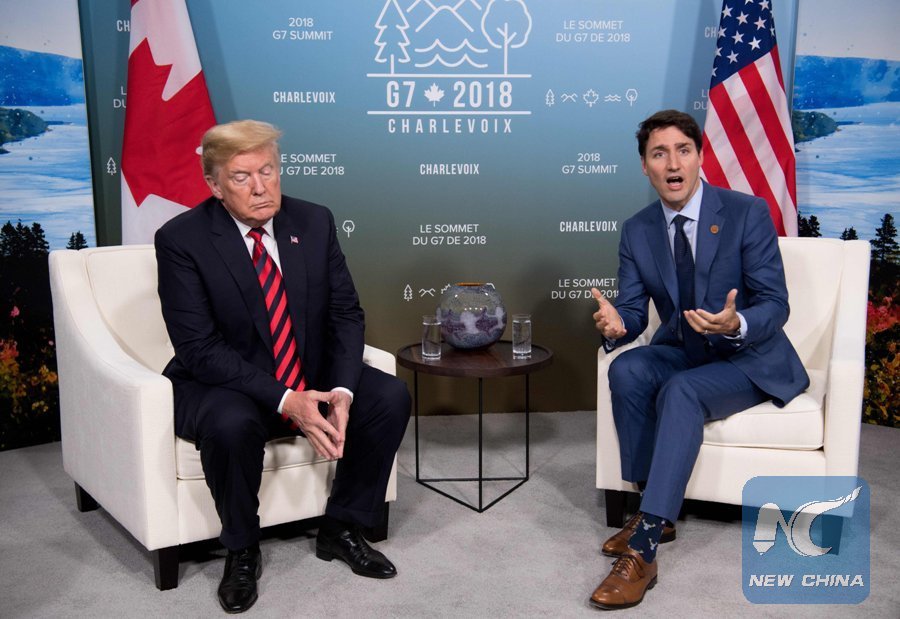 In this file photo taken on June 08, 2018 showing U.S. President Donald Trump (R) and Canadian Prime Minister Justin Trudeau holding a meeting on the sidelines of the G7 Summit in La Malbaie, Quebec, Canada. Canada hits back at the United States on June 08, 2018, with retaliatory tariffs on American summer time essentials in its opening salvo in a trade war with President Donald Trump. (Xinhua/ AFP PHOTO)
