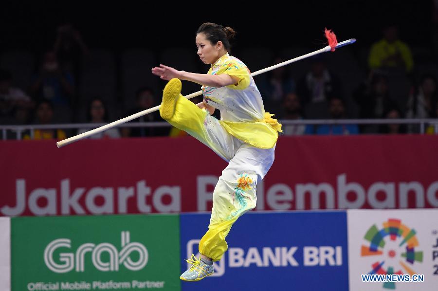 Duong Thuy Vi of Vietnam competes during the Qiangshu competition of Women's Jianshu & Qiangshu All-Round match at the 18th Asian Games in Jakarta, Indonesia, Aug. 21, 2018. (Xinhua/Cheong Kam Ka)