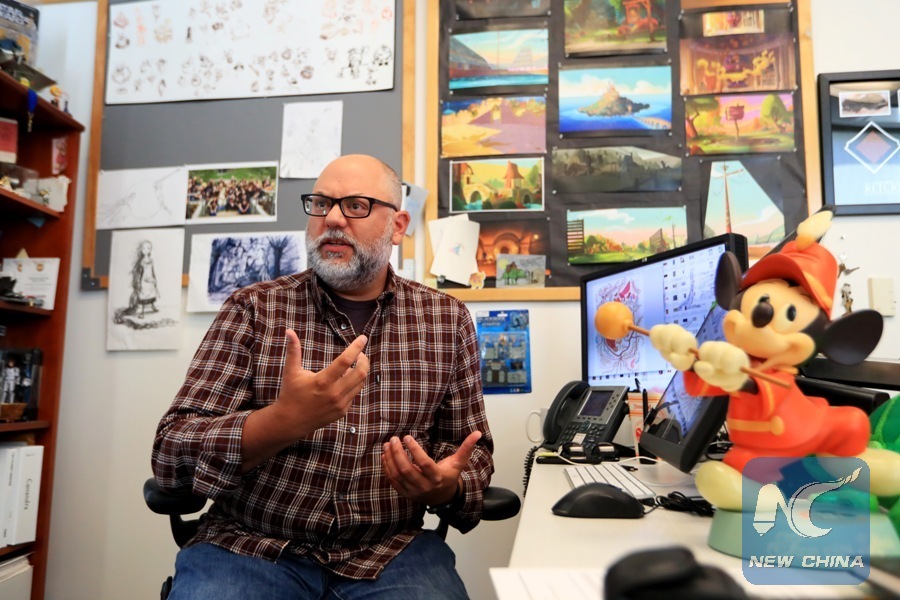 Chris Sonnenburg, executive producer and supervising director of Disney's "Tangled" series, speaks in an interview during the 3rd training session for Chinese animation professionals in Los Angeles, the United States, Sept. 4, 2018. (Xinhua/Li Ying)